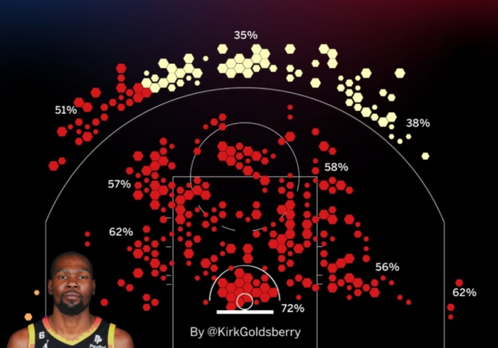 布克在场时,杜兰特真实命中率64%;布克不在时,杜兰特78%……