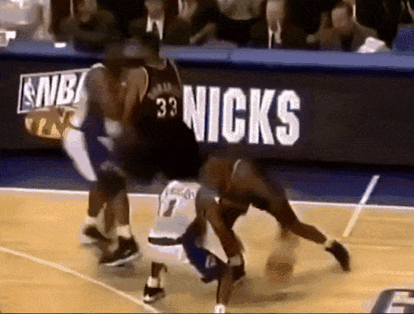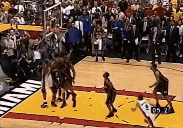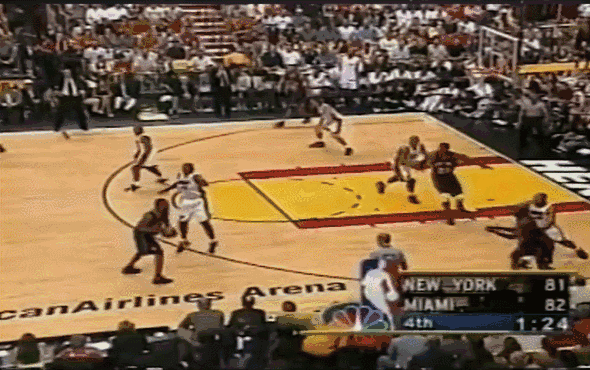 第四场依然是典型的尼克斯对热火绞肉机式的血战,曾经作为黄蜂双核的拉里-约翰逊与莫宁在场上大打出手,造就了杰夫-范甘迪跪在地上死死抱住热火核心大腿以保护自己球员的名场面,尼克斯5分险胜,带着2:2的大比分去迈阿密打生死战。