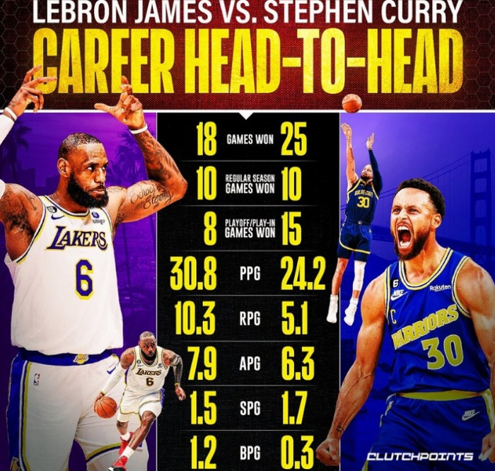 美媒ClutchPoints统计了詹姆斯和库里生涯交手纪录和数据,详情如下: