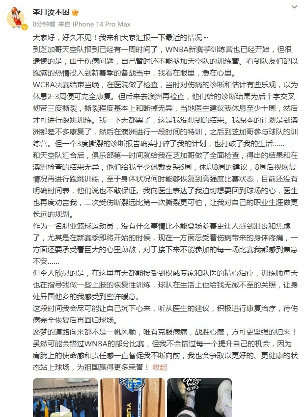 虽然可能会错过WNBA的部分比赛,但我不会错过每一个提升自己的机会,因为肩膀上的使命感和责任感一直督促我不断向前,我也会争取以更好的、更健康的状态站上球场,为祖国赢得更多荣誉!