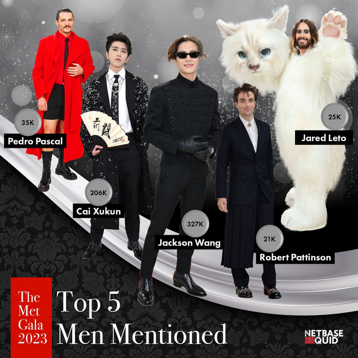 NetBase Quid根据社媒数据分析统计,王嘉尔和蔡徐坤是今年Met Gala被提及最多(最受关注)的男明星,女明星这边排名第一的则是BLACKPINK的金珍妮。