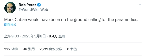 媒体人Rob Perez写道:“如果是马克-库班的话,他已经倒地呼叫医护人员了!”