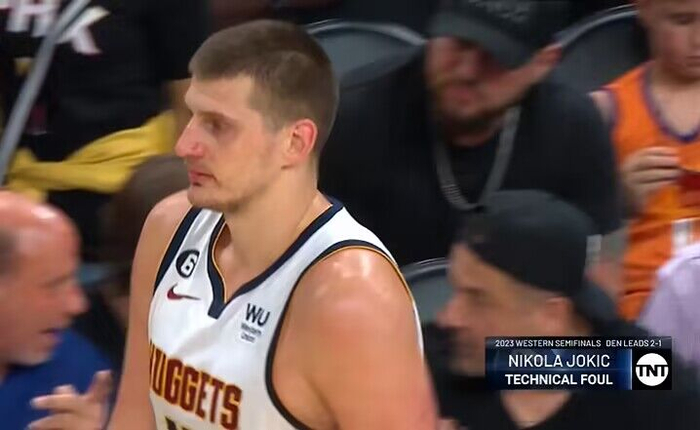 比赛进行期间,约基奇在场边一肘子推倒了太阳队老板,后者重重地坐在椅子上。