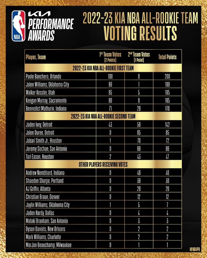 而值得一提的是,雷霆的34号秀杰林-威廉姆斯(Jaylin Williams,6号)获得了一张第一选票,他是落选最佳新秀阵容中唯一一位获得第一选票的球员。