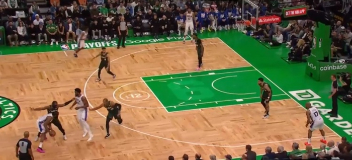 一是76人这场比赛的若干挡拆回合,定点球员会尝试切入或站扣篮位清空罚球线以上区域。我不确定这是刻意而为还是偶然结果,但达成的效果是,76人的挡拆比较容易获得较少干扰的跳投机会,凯尔特人基本只能靠中锋去补持球投或者掩护人的接球投,显然很难兼顾。76人这场进攻暴走的主要部分是跳投,恩比德不持球往里运也就不会遭遇恼人的刷卡协防和夹击,使得凯尔特人上协防的难度加大。凯尔特人这场的防守虽然不好,但他们确实很难防追求罚球线以上跳投机会的76人,这个很看脸的;