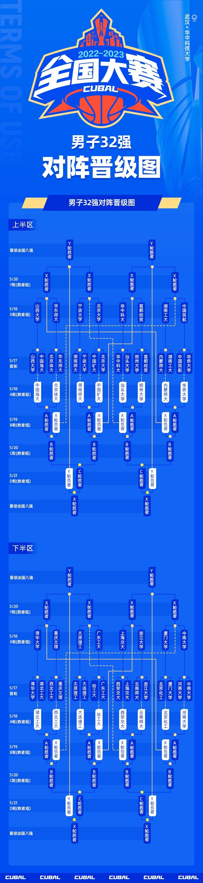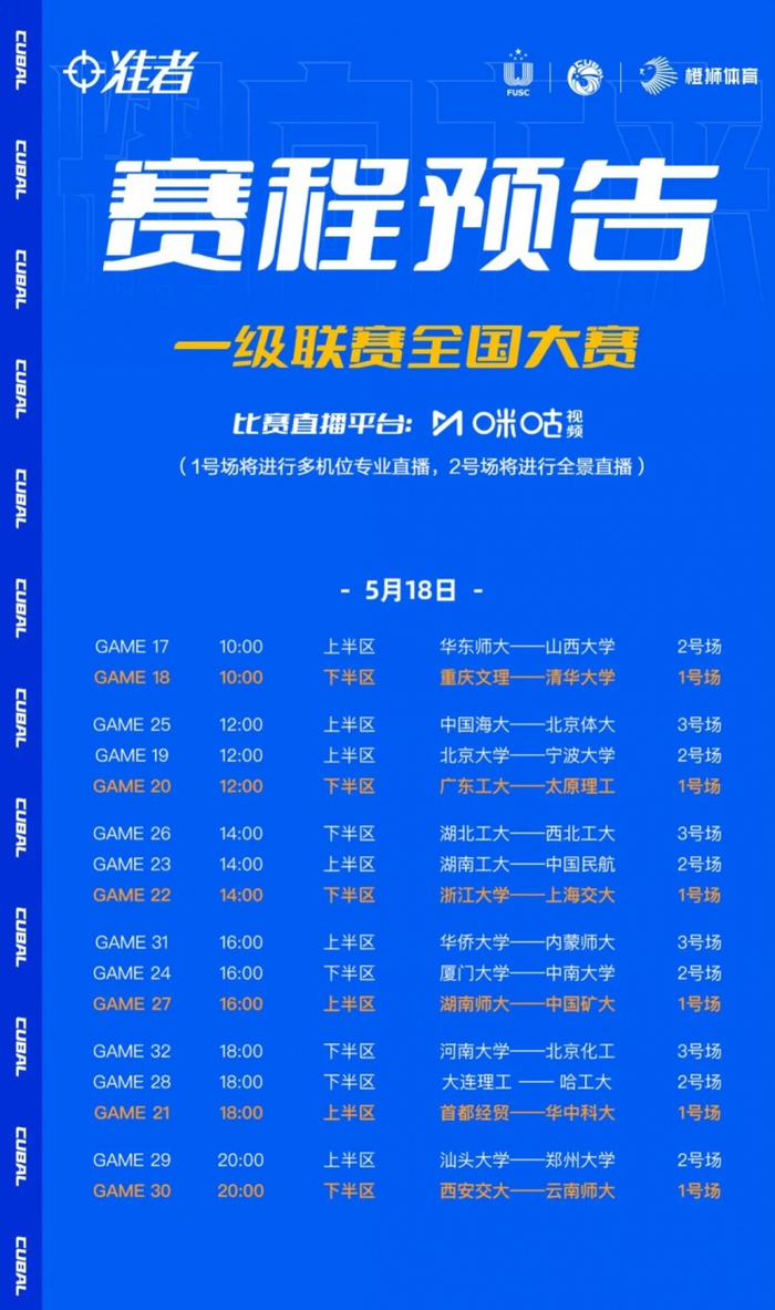 5月17日,第25届中国大学生篮球联赛男篮全国32强赛在华中科技大学正式揭幕!上半区中国民航战胜东南王华侨大学,北京大学战胜中国矿大,取得首胜;另外华东师大、山西大学、宁波大学、首经贸、华中科大、湖南工大分别取胜。下半区,交大德比,上海交大战胜西安交大,重庆文理、太原理工、清华大学、广东工大、中南大学、浙江大学、厦门大学分别战胜对手。明日进行第二轮比拼,多场焦点战!文末附赛程。