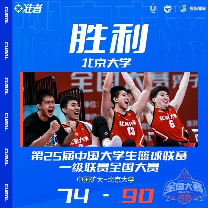 易边再战,贺赵杰先发制人三分打进,但李苑鑫站稳篮下配合外线里突外投稳住分差。而后韩浩宇陈宇飞罗浩源三人连续上演飞身上篮极快拉开分差。三节战罢,比分55:72。末节,北大积极拼抢篮板保持领先优势,达到火热时刻双方更是互相送上大帽封盖,虽然矿大一度将分差缩小回个位数,但无奈分差过大难以追回,最终全场比赛结束,比分74:90。