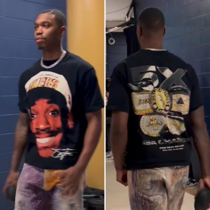 本场比赛,湖人球员朗尼-沃克身穿球队名宿科比T恤入场,背后是科比生涯获得的5枚总冠军戒指图案。