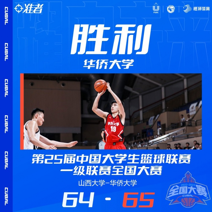 末节,张文逸率先后仰打进,但刘江潮马上回敬一记三分缩小分差,随后连续切进内线篮下命中,随后周其默三分打进,比分持平。王佳琦手起刀落中投打进,,山西大学再次领先,双方持续拉锯比分交替领先。山西大学抓住机会,连续的篮下脚步得分拉开分差,山西大学领先4分。李绪建关键上篮命中,分差缩小至2分,周其默超远三分命中,华侨大学在时间仅剩30秒的时候,完成了反超。但马上张文逸一个后仰中投,比分再次反超。李续建内线完成勾手打进,华大再次反超。时间仅剩12秒,山西大学球权。最后时刻,华大严防死守,成功将山西大学拦在门外。最终全场比分64:65,华侨大学胜!