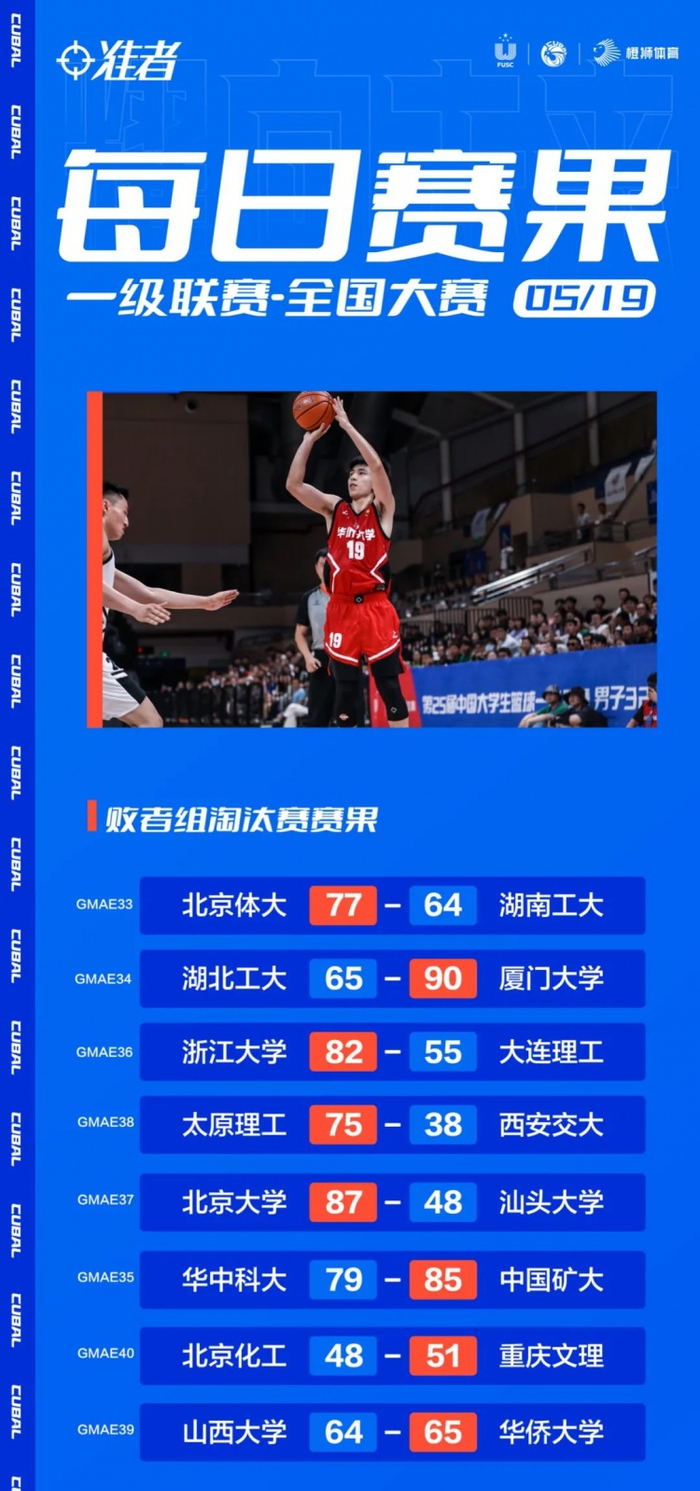 5月19日,来到全国大赛的第三个比赛日,败者组今日进行淘汰赛,华侨大学逆转再逆转,最终1分险胜山西大学!重庆文理最后一分钟逆转战胜北京化工!中国矿大一番鏖战后战胜华中科大,太原理工大胜西安交大,北体大、厦门大学、浙江大学、北京大学分别战胜对手晋级下一轮比赛。湖南工大、湖北工大、大连理工、西安交大、华中科大、汕头大学、北京化工、山西大学止步全国24强。
