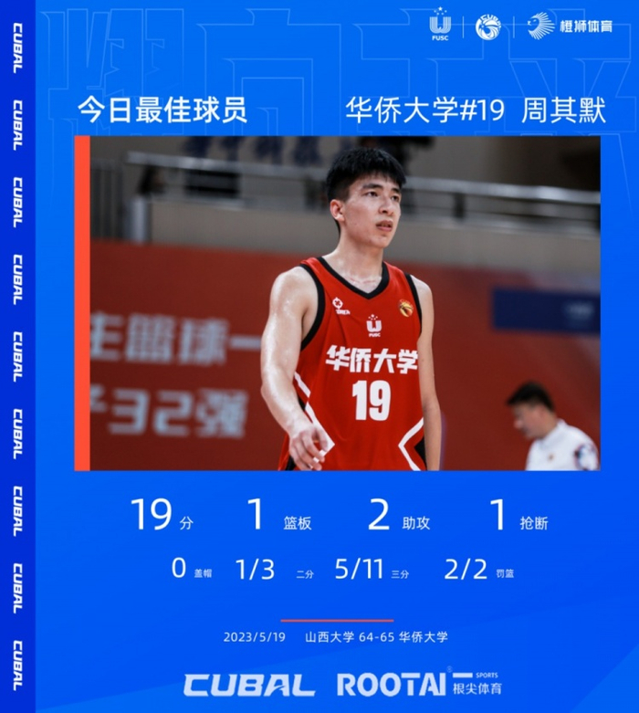 今日的最佳球员给到华侨大学19号周其默,在这场东南王与西北王的厮杀中,在面对山西大学的严防死守,通过积极的跑位和拼抢,在拿下19分1篮板2助攻的数据的同时,也为华侨大学拼出了明天,胜利从来都来之不易,没有人能够一直赢,那我们就加油拼下每一场,华侨大学,加油!