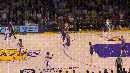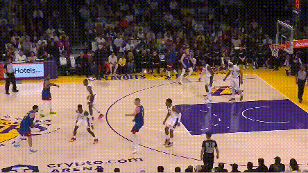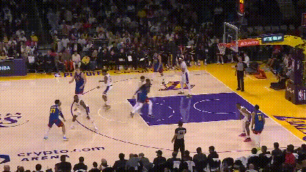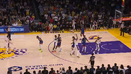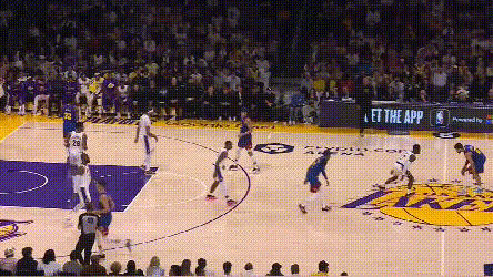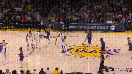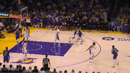 掘金的弱侧射手回应表现强于湖人。就不谈约基奇吸引夹击,穆雷突分改变阵型创造的机会了。最令人印象深刻的是,约基奇不在场时,布朗的这次突分——掘金就知道湖人一定会漏三分线,布朗突得非常耐心,波特也没有让他的耐心白费。