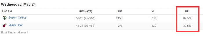 直播吧5月22日讯 权威美媒ESPN目前对东部决赛的最新BPI预测更新了数据。