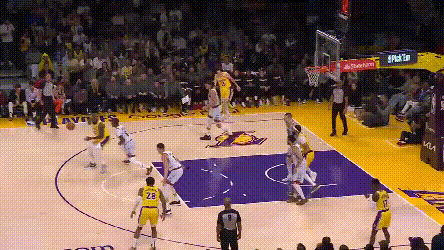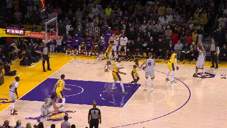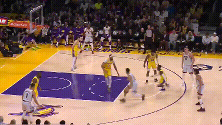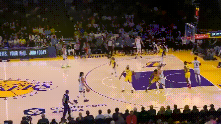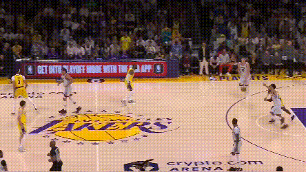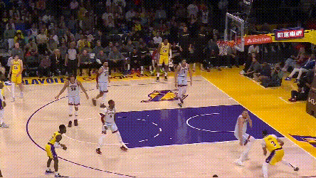 在湖人的防守针对下,约基奇不好碾压式一对一,也不好流畅地掩护顺下,或者反复找浓眉身后,但他却能在湖人的防守缝隙中不断看到机会。之前三场的复盘中提到,湖人选择了强侧夹击约基奇低位,靠弱侧提前轮转来补空位。但如果湖人有那么1~2个球员在轮转上稍微懈怠了呢?