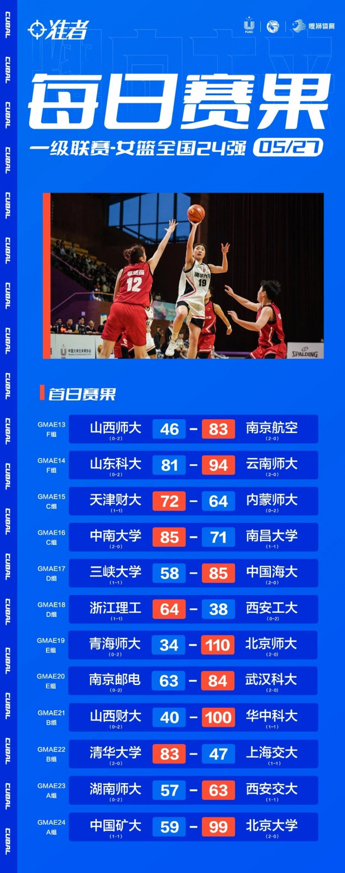 CUBAL女篮24强第二日战果:北师大110-34大胜青海师大