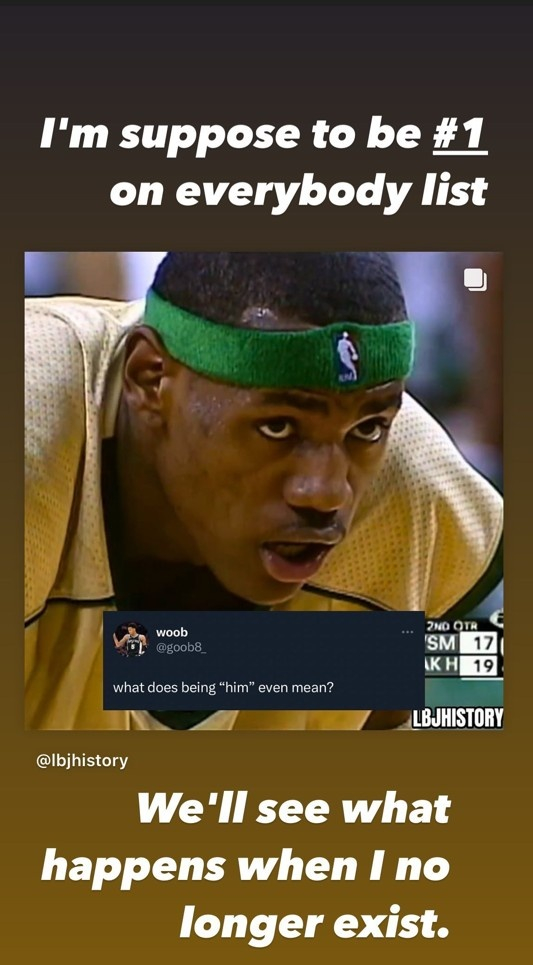 詹姆斯引用了一段著名说唱歌手Jay-Z中的歌词回复道:“我在每个人的榜单上都该排第1,我们将看到当我不再存在时会发生什么。”