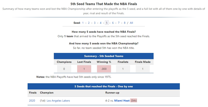 5号种子:历史上仅2020年的热火闯进过总决赛。