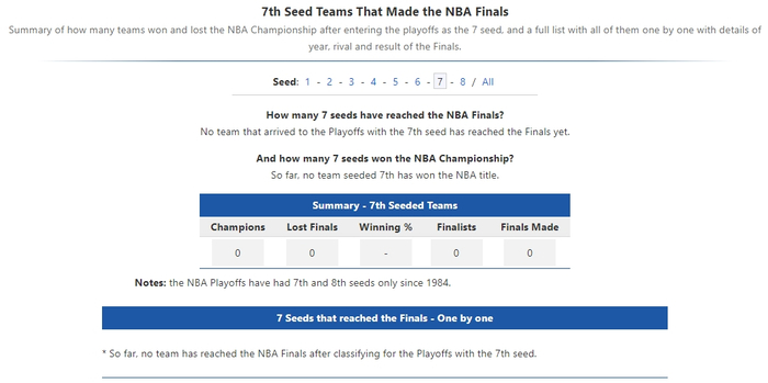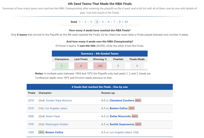 4号种子:历史上共5队进过总决赛,但仅69年凯尔特人成功夺冠。其余冠军都由3、2、1号种子包揽,次数为8次、16次、50次。