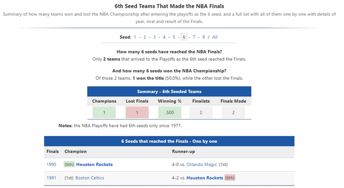6号种子:至今仅2队进过总决赛,仅95年火箭成功夺冠(历史排名最低的总冠军)。