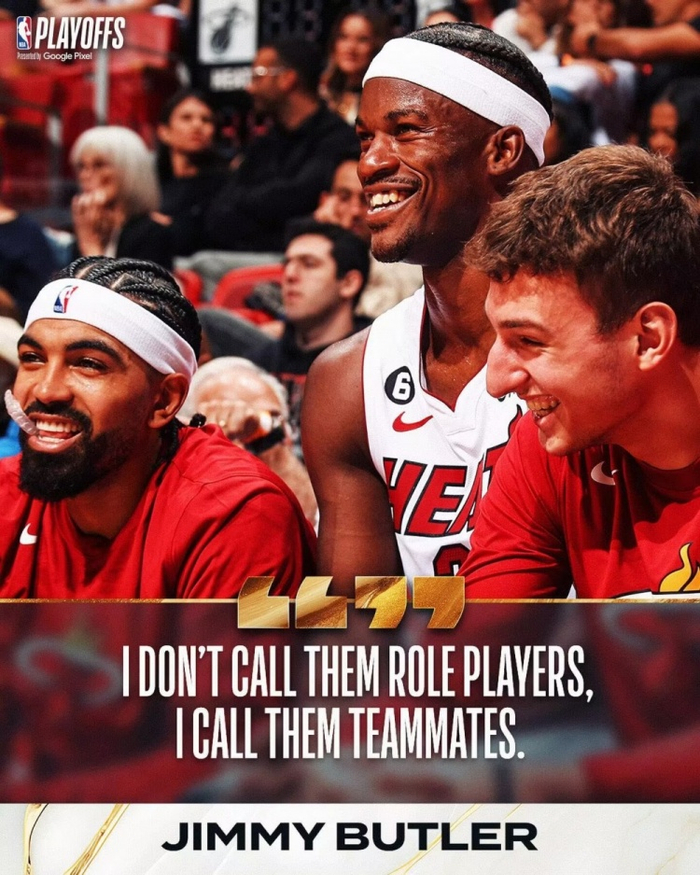 赛后,巴特勒接受了记者采访。谈到队友,他说道:“我不会称他们为角色球员,我会称他们为队友。因为角色都可以改变,尤其是他们付出了这么多。我有一些真正的篮球队友,他们能得分,能防守,能传球。”