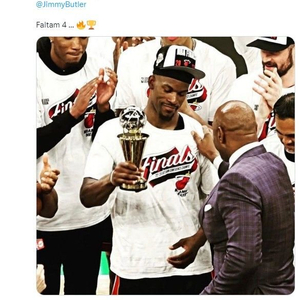 巴西球星内马尔在推特上晒出巴特勒手捧“拉里-伯德”杯的照片,并写道:“MVP ...祝贺我的兄弟❤️@JimmyButler,还剩4场……🔥🏆”