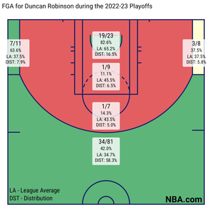 季后赛中,邓罗在篮下的命中率仅次于小佩顿(至少出手20次)