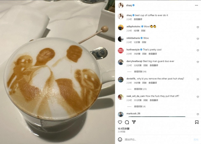 拉花图案是OK组合捧杯照!奥尼尔INS晒咖啡照:历史最佳咖啡