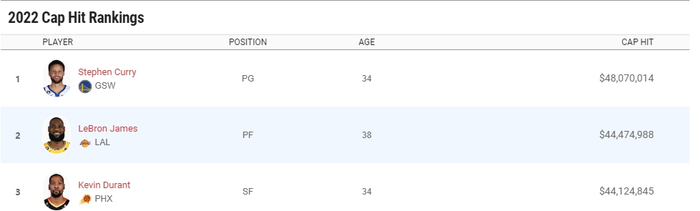本赛季年薪前三名:库里4807万美元、詹姆斯4447万美元、杜兰特4412万美元