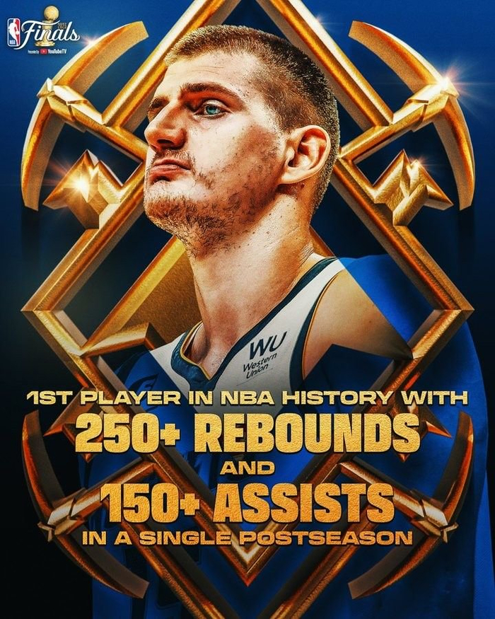 这样一来,约基奇今年季后赛至今已经得到572分251篮板185助攻,他成为NBA历史上首位单个季后赛至少拿下250板150助的球员。