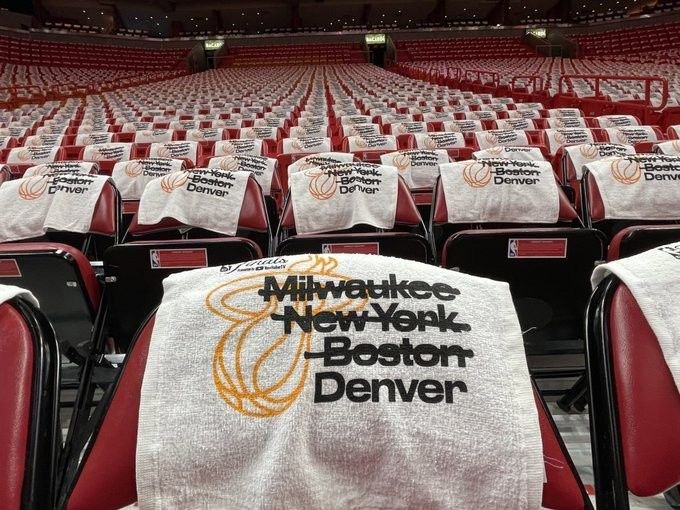 NBA记者Tomer Azarly晒出热火主场座位上赠送的毛巾,毛巾中划掉了热火前三轮淘汰的对手雄鹿、尼克斯和凯尔特人,目前仅剩丹佛。