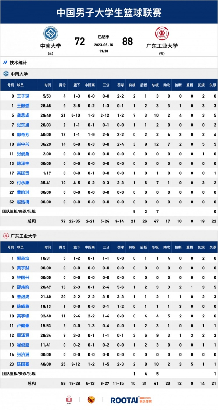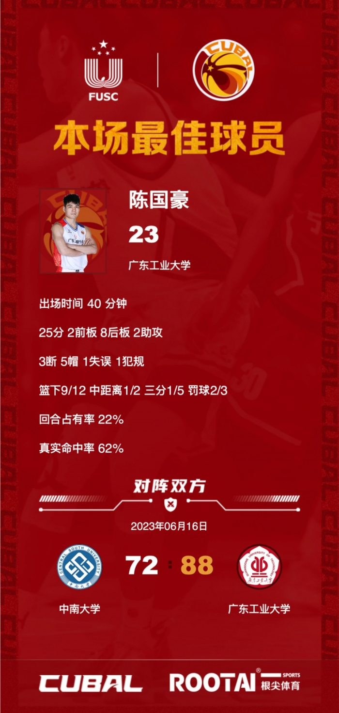 数据方面,广东工大陈国豪25分10篮板2助攻3抢断5盖帽、曾煜成20分2篮板、邵炜昀15分3篮板3助攻2抢断、高宇锋11分4篮板5助攻2抢断;中南大学龚思成21分10篮板2助攻4抢断、赵中兴12分12篮板7助攻2抢断、郭奇芳12分2篮板4助攻3抢断、付永康10分7篮板。