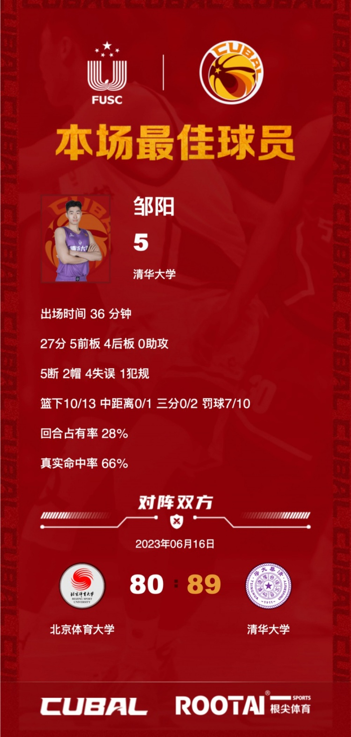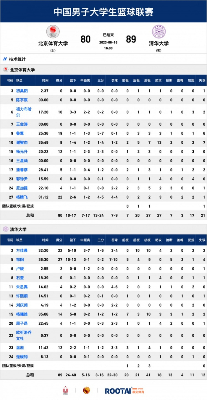 数据方面,清华大学邹阳27分9篮板5抢断2盖帽、方佳晨22分10篮板4助攻2抢断、杨曦皓14分10篮板3助攻3抢断;北京体育大学谢智杰8分7篮板13助攻2抢断、杨腾飞22分2篮板3助攻、鲁骜19分3篮板3助攻。