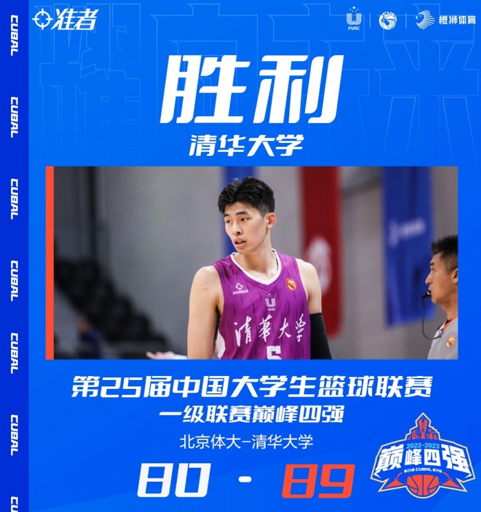 末节决战,温凇和鲁骜对飙三分,北体大后劲不足,清华大学利用强大的团队优势多点开花完成14-1的进攻高潮一举将分差拉开到两位数,祖力布哈尔抛投打中止血,谢智杰和鲁骜先后三分命中帮助北体大完成8-0的攻势续命,方佳晨抢断反击得手杀死比赛。最终,清华89-80力克北体大,率先杀入决赛。