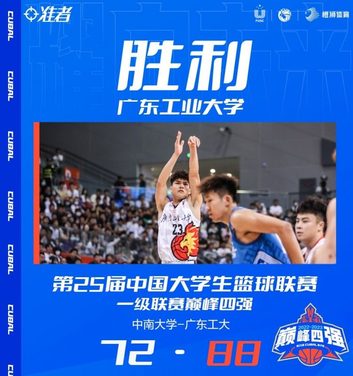 第四节,龚思成先中三分,广东工大持续发力连中三分打出15-3的攻击波取得两位数领先,赵中兴利用个人能力连中两球苦苦支撑,陈国豪连投带罚拿到6分帮助广东工大保持两位数领先。中南大学大势已去无力回天,最终,广东工大88-72击败中南大学,和清华大学会师决赛。