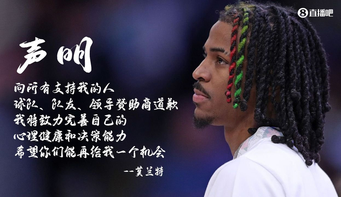 莫兰特本人发布声明:“我需要反思自己,我意识到自己造成了非常大的伤害。我想向NBA、灰熊、我的队友和孟菲斯市道歉。对NBA总裁和球队领导们道歉,他们给了我成为职业运动员的机会并支持了我,我对我造成的伤害感到抱歉。