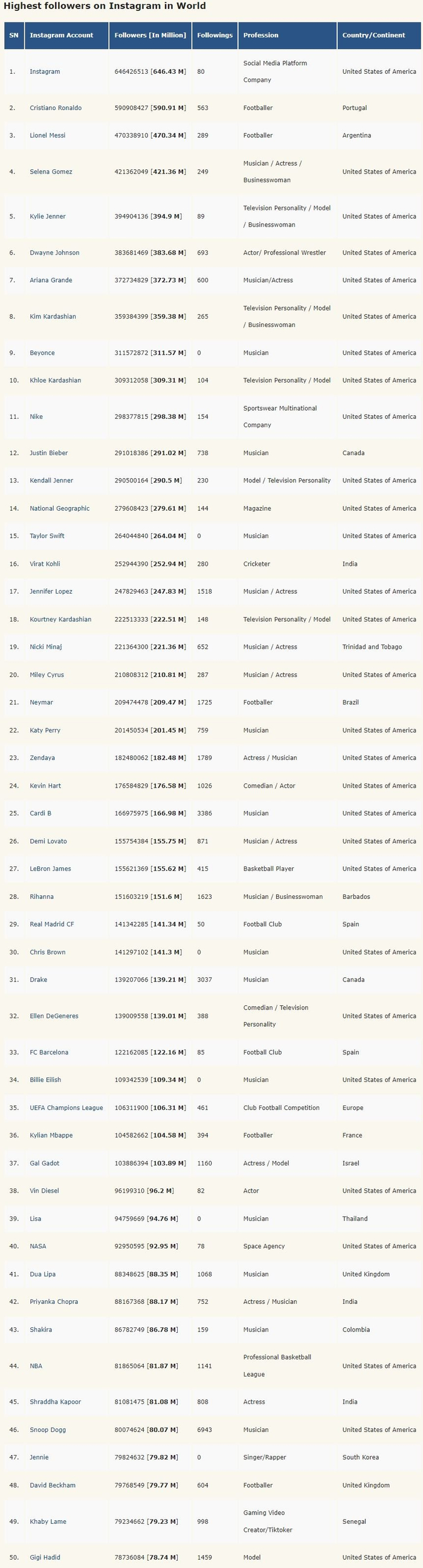 以下为外媒在本月18号统计的Instagram粉丝排行总榜——
