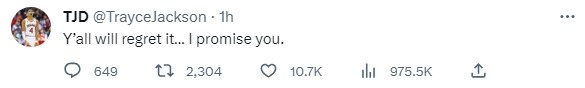 特雷斯-杰克逊-戴维斯在个人社媒上放话:“你们全都会后悔的,我保证。”