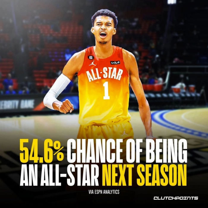 而根据ESPN的数据分析显示,文班亚马下赛季就入选全明星的概率为54.6%。