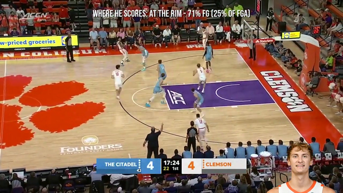 2、错位进攻。泰森有惩罚错位的能力。他在低位有不错的技术和柔和的手感,喜欢进行翻身中投,空间开阔时还能从底线突破,篮下终结效率很高。泰森在无球跑位时喜欢利用灵活性和速度甩开防守,切入篮下,他的内外切入频率比较平衡,不容易被针对。