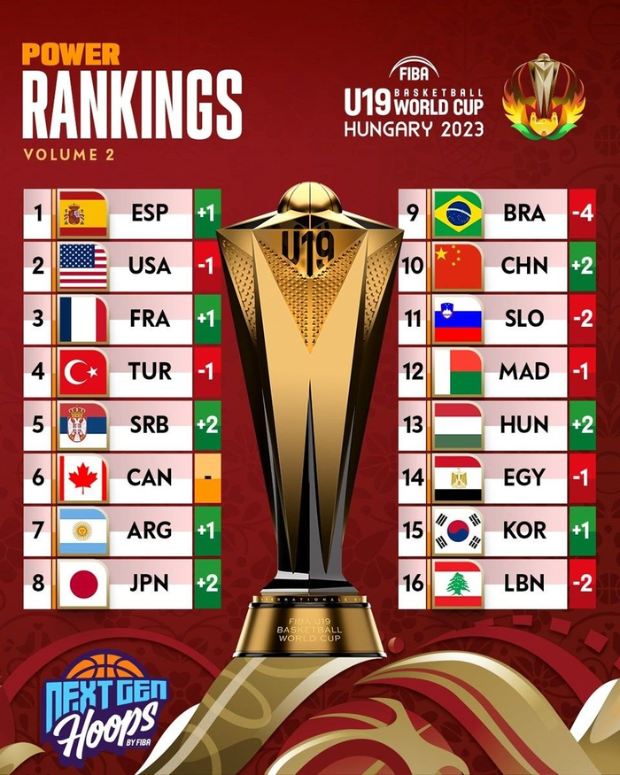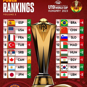 直播吧6月29日讯 FIBA更新了男篮U19的实力榜,中国虽然遭遇4连败,但从赛前的第12升至了第十,排名还在斯洛文尼亚之上,西班牙则超越美国升至了第一: