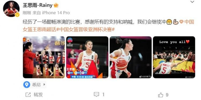 赛后,王思雨更博晒出了本场比赛的赛场照,配文写道:“经历了一场酣畅淋漓的比赛,感谢所有的支持和呐喊,我们会继续冲。”