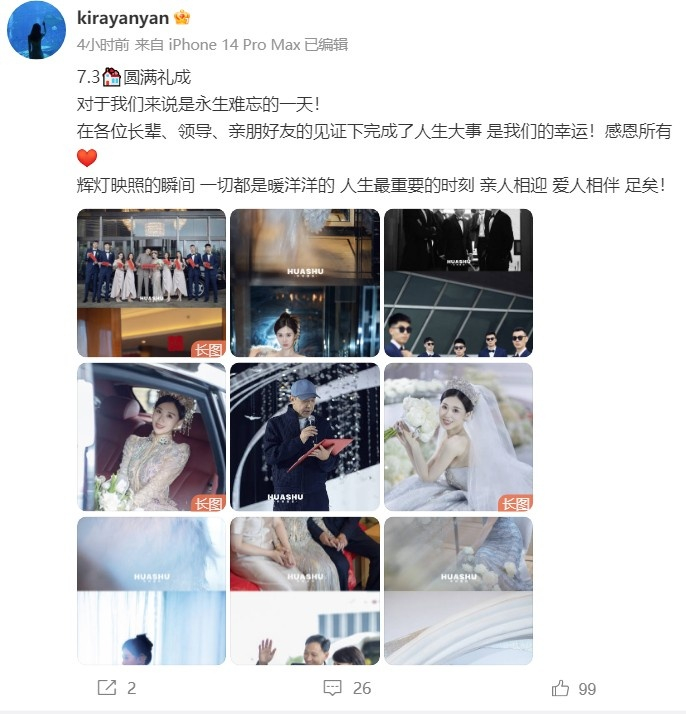 雷蒙妻子配文写道:“7.3圆满礼成,对于我们来说是永生难忘的一天!在各位长辈、领导、亲朋好友的见证下完成了人生大事 是我们的幸运!感恩所有,辉灯映照的瞬间,一切都是暖洋洋的。人生最重要的时刻,亲人相迎,爱人相伴,足矣! ”