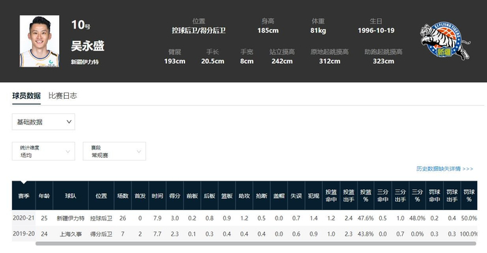 2019年来到CBA后,吴永盛的表现机会也不多,目前返回宝岛P+联赛效力,上赛季场均也仅有6.2分。