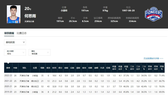 来自山西大学的何思雨,以外线投射见长,2021-22赛季“津门勇士”时隔八年重返季后赛,何思雨也是外线火炮之一。