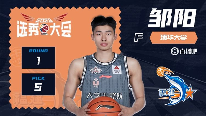 直播吧7月15日讯 2023年CBA选秀大会,福建用5号签选中来自清华大学的邹阳。