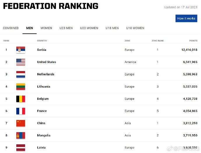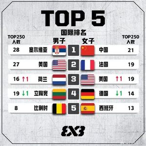 直播吧7月18日讯 今天,FIBA3x3官方更新了最新一期的三人篮球世界排名。
