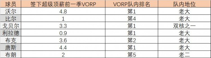 布朗是不值这个价的。虽然以往拿到超级顶薪的球员也有很多人配不上合同,其中沃尔被伤病所累,在史上最烂合同榜上的位置无人可以撼动,但布朗的情况还是小小地打破了一个记录——相比“前辈”们,他是拿到超级顶薪球员里,唯一既不是名义上的大当家,又不是签约前一季球队最具比赛影响力的球员。上个赛季,布朗的BPM排名凯尔特人第6,VORP排名第5,不用跟拿过MVP的哈登、威少、库里、字母、约基奇去比,跟其他几个相对“拉”一些同道中人对比,也是特立独行。