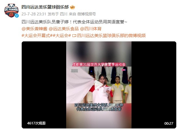 直播吧7月29日讯 在昨晚结束的成都大运会开幕式上,中国大运女篮球员唐子婷作为运动员代表向大运会庄严宣誓:“服从裁判,尊重对手,尊重观众,对兴奋剂零容忍,弘扬奥林匹克精神。”