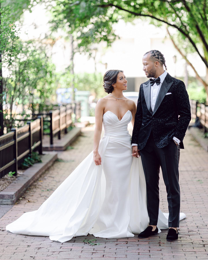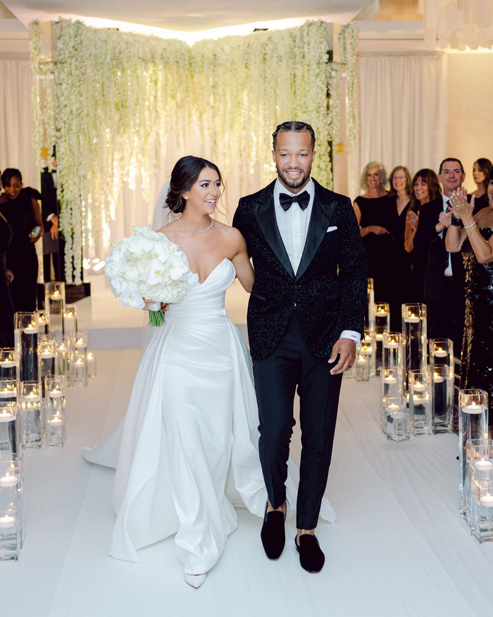 直播吧7月31日讯 尼克斯球星布伦森上周末在芝加哥的丽思卡尔顿酒店,与相恋十年的女友Ali Marks正式完婚,二人今日共同发布了婚礼照片,并配文:“07.29.23 🤍。”