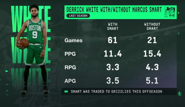 谈到自己需要做的最大调整,怀特说:“我不认为需要什么太大的调整。只是我需要更多持球,就像我在大部分生涯里要做得那样。让每个人处在正确的位置,我身边有塔图姆和杰伦,现在又有了波尔津吉斯,他们会让我的工作变得简单。”